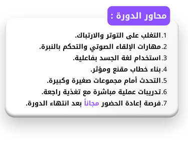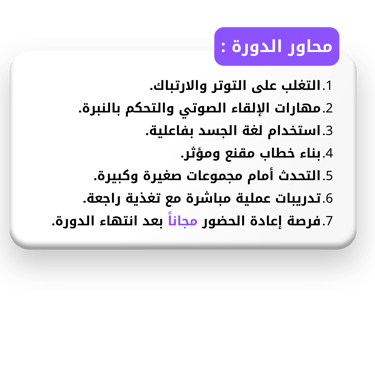 من خلال تدريبات عملية وأمثلة واقعية، رح تتعلم كيف ترتب أفكارك، تتحكم بصوتك، وتستخدم لغة جسدك بطريقة مؤثرة.