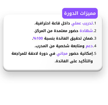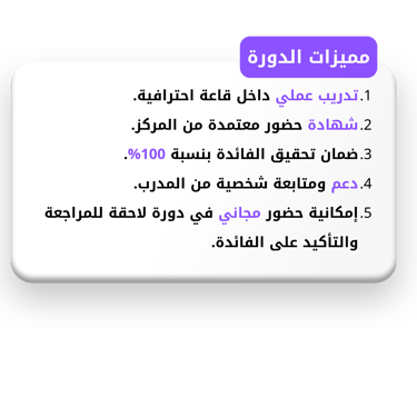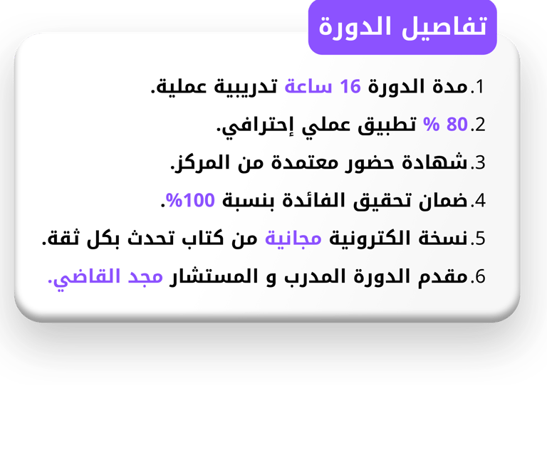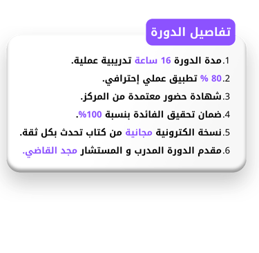 مدة الدورة الكاملة هي [16 ساعة تدريبية] 80% جلسات عملية وتدريبات تفاعلية.