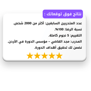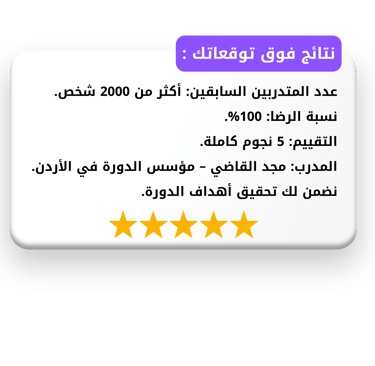 نضمنلك إنك تخرج من دورتنا بفائدة حقيقية وتغيير ملموس في شخصيتك ومهاراتك بنسبة 100%، لأننا ببساطة نقدّم تدريب مختلف… تدريب يغيّر حياتك.